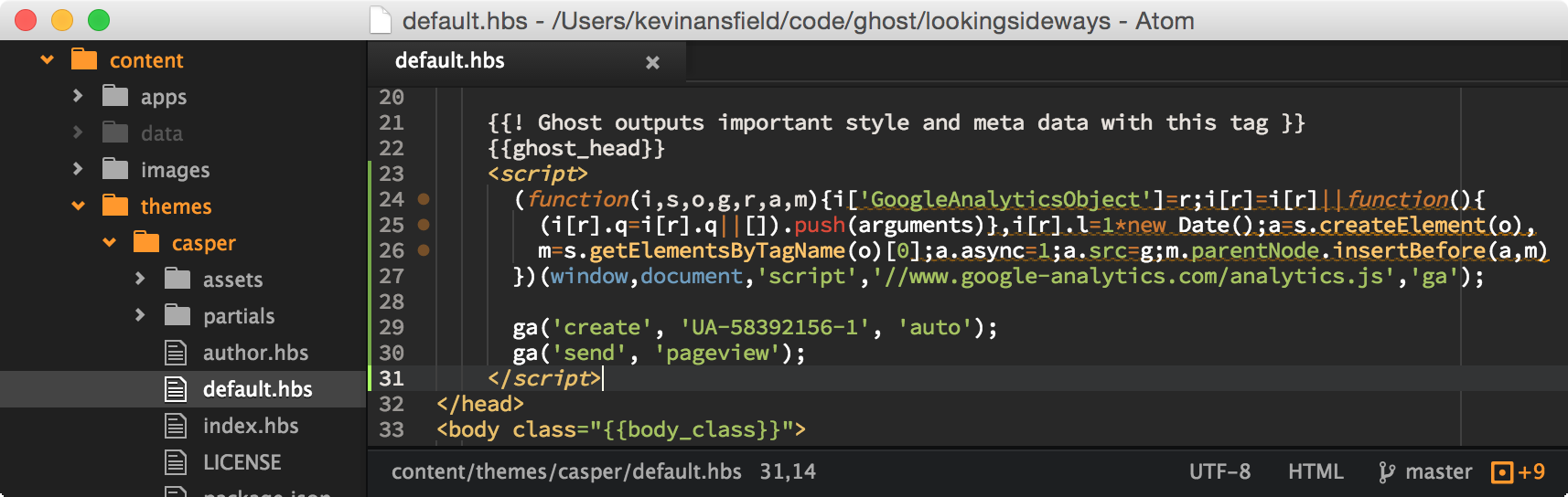 Now you can visit your blog at http://localhost:2368. Test that your changes have worked by opening up the Web Inspector and verifying that your tracking code is present: